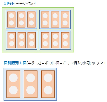 | その他 | 1セット=半ダース×4箱 半ダース=ゴルフボール2個入り×3スリーブ 単品(半ダース)購入可 |