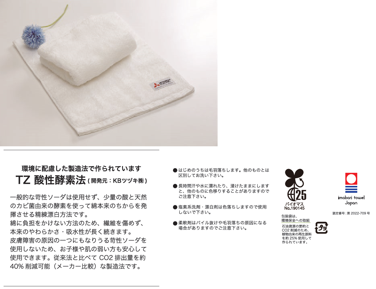 ① 従来法よりCO2排出量を約40%削減可能(メーカー比較)な、環境に配慮した精錬漂白方法で作られています。